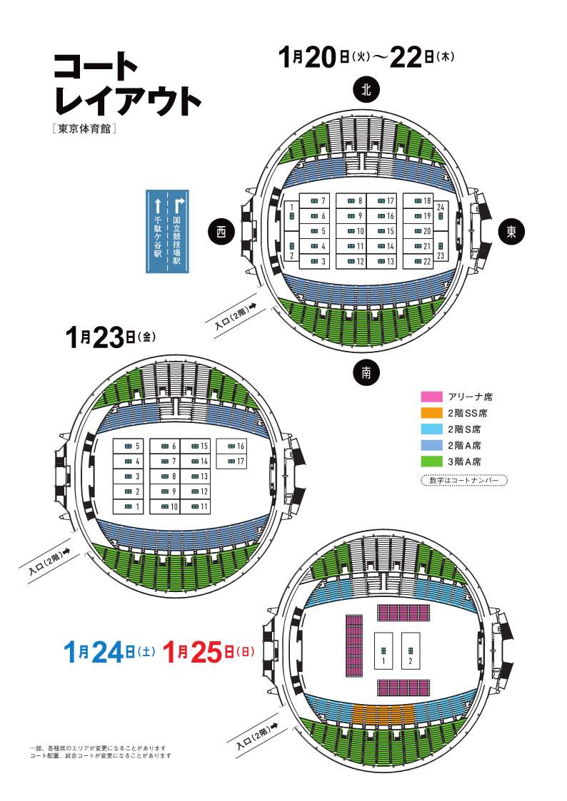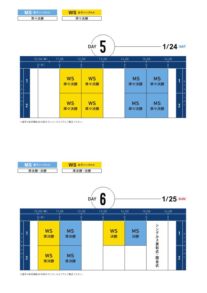 | 1/25(日) | 女子シングルス準決勝~決勝 男子シングルス準決勝~決勝 |